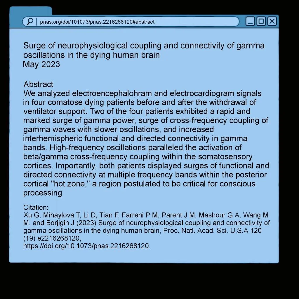 Since 2014, there has been a study in Michigan involving four patients who died while being monitored by EEG due to cardiac arrest-induced anoxic injury. Of these four patients, two exhibited notable brain activity, particularly in a region thought to be important for conscious processing. If these findings are accurate, they could support my idea of a psychological afterlife. Additionally, it is intriguing that only a portion of the patients exhibited brain activity after their last heartbeat, corresponding to the previous study I mentioned.